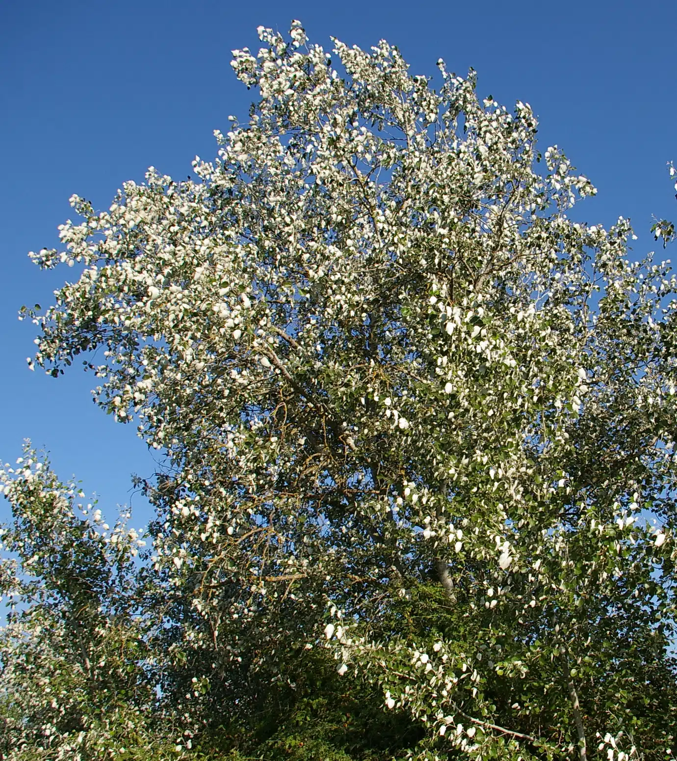 Árbol de gran porte con hojas que muestran el envés blanquecino al viento, muy utilizado para cortinas forestales.