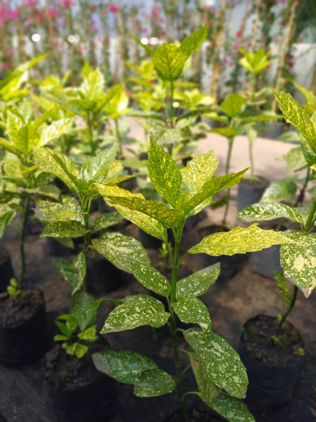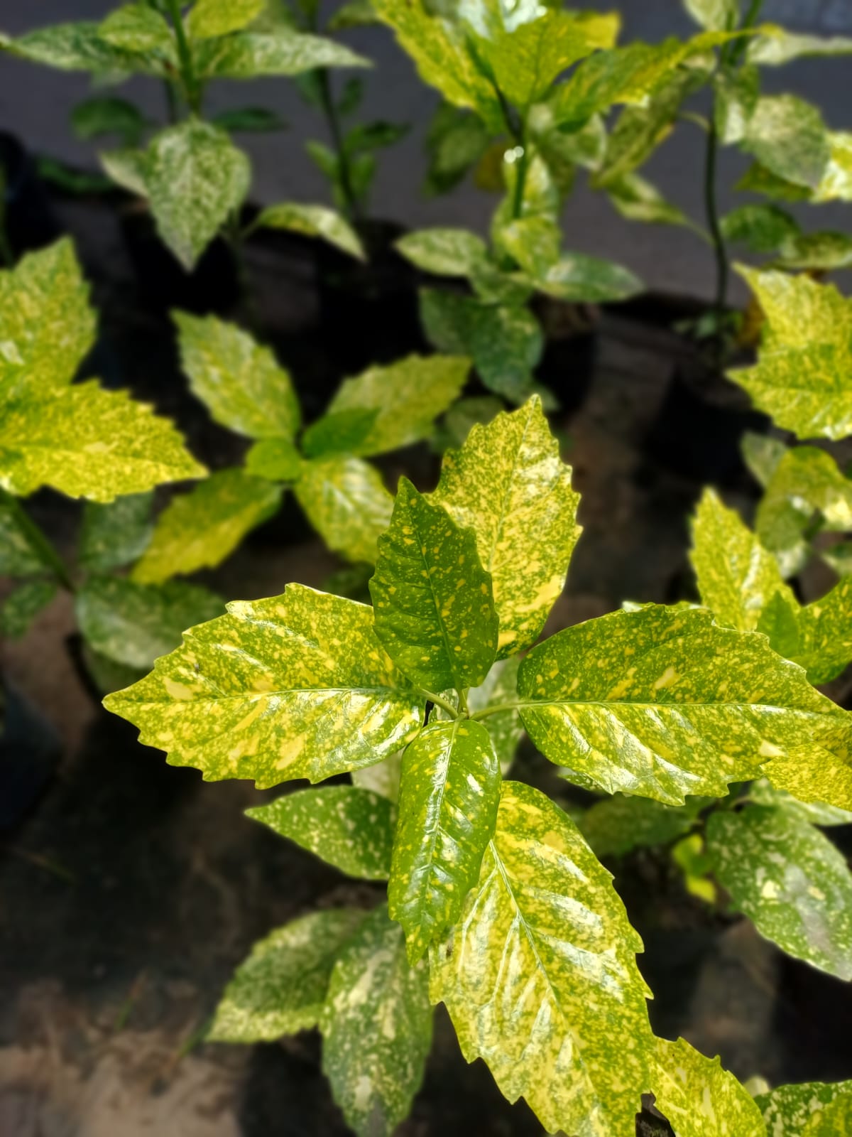 Arbusto perenne de porte compacto y follaje muy decorativo. Sus hojas son grandes, coriáceas, verdes con manchas amarillas que aportan un contraste atractivo durante todo el año.