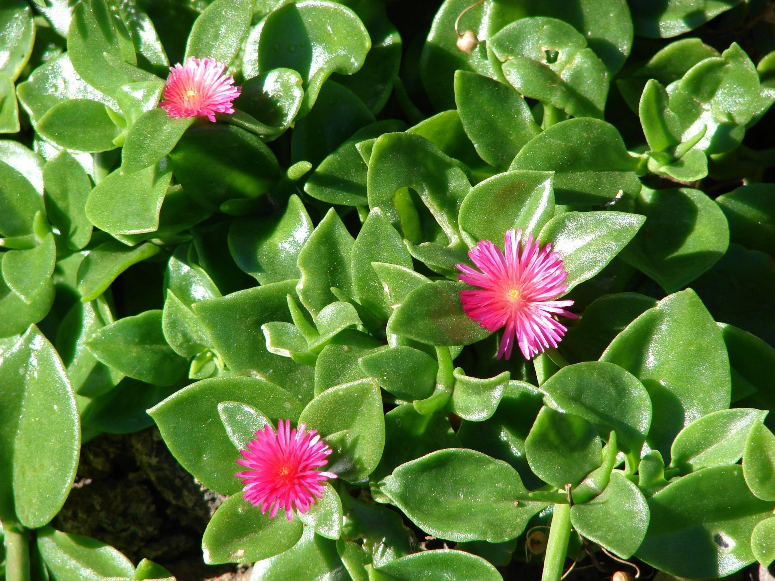 Suculenta rastrera de hojas carnosas y flores pequeñas rosadas, ideal para cubrir suelos soleados.