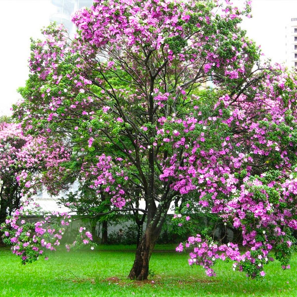 Árbol ornamental con flores en forma de orquídea, que decoran y atraen polinizadores durante la primavera.