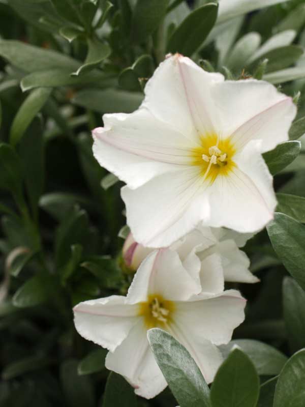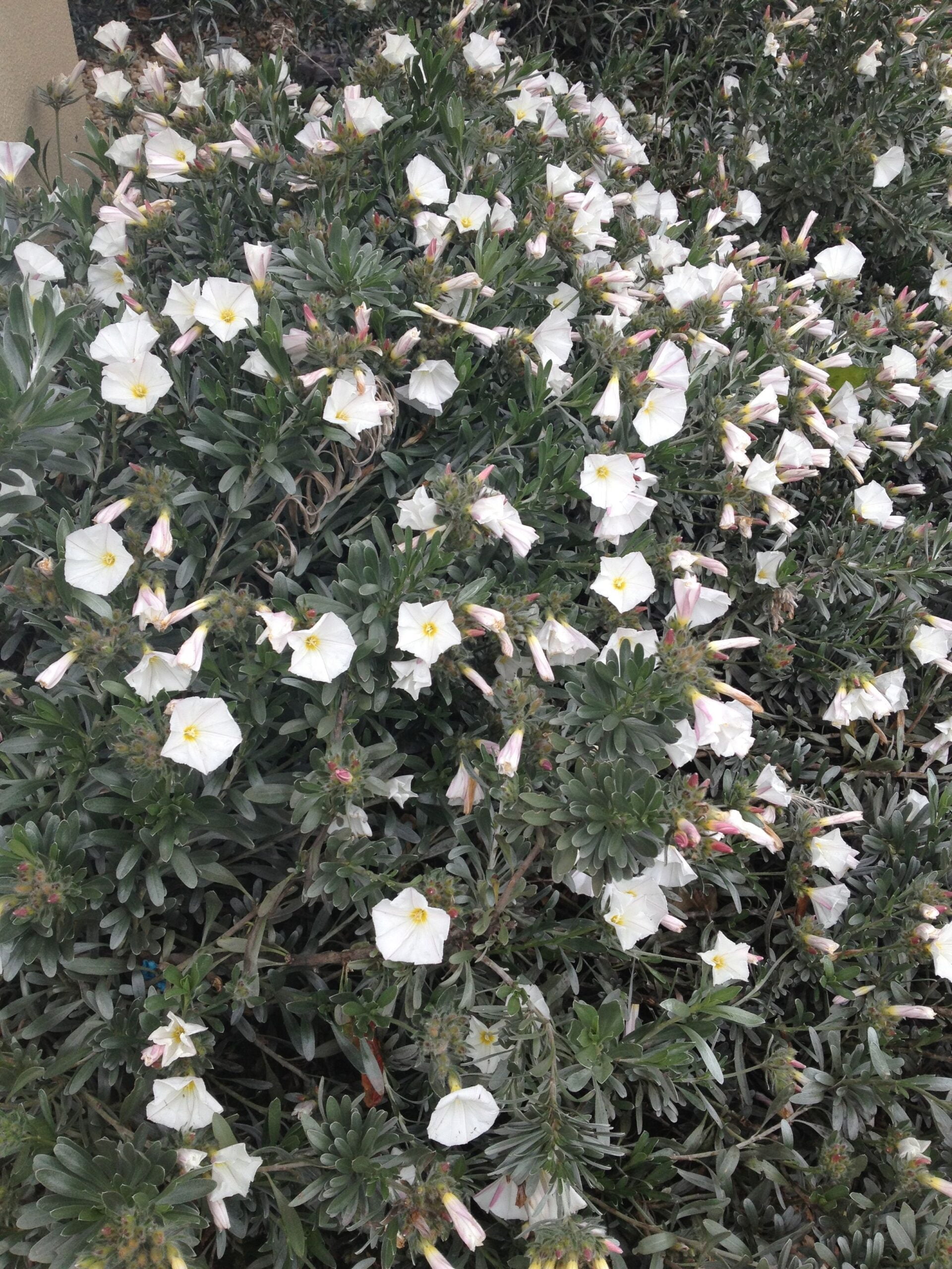 Planta rastrera o colgante, de follaje gris plateado y flores pequeñas en tonos blancos o azules. Muy usada en canteros y borduras.