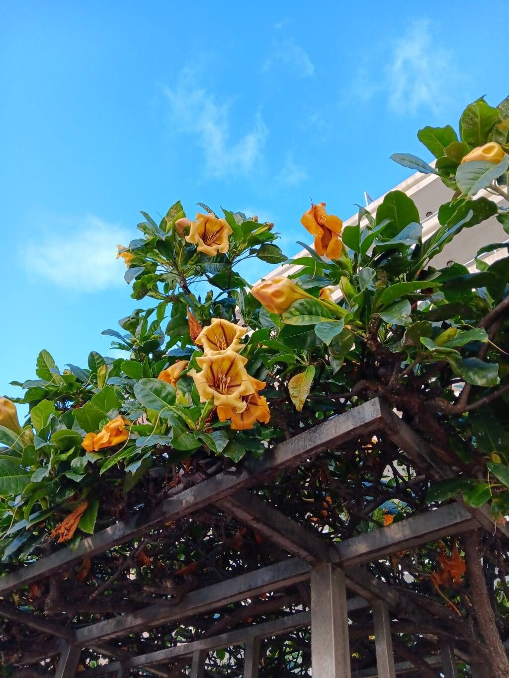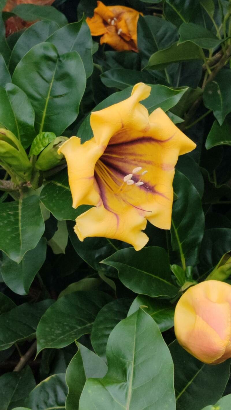 Enredadera tropical de grandes flores amarillas en forma de copa, muy vistosa y perfumada.