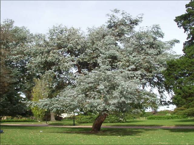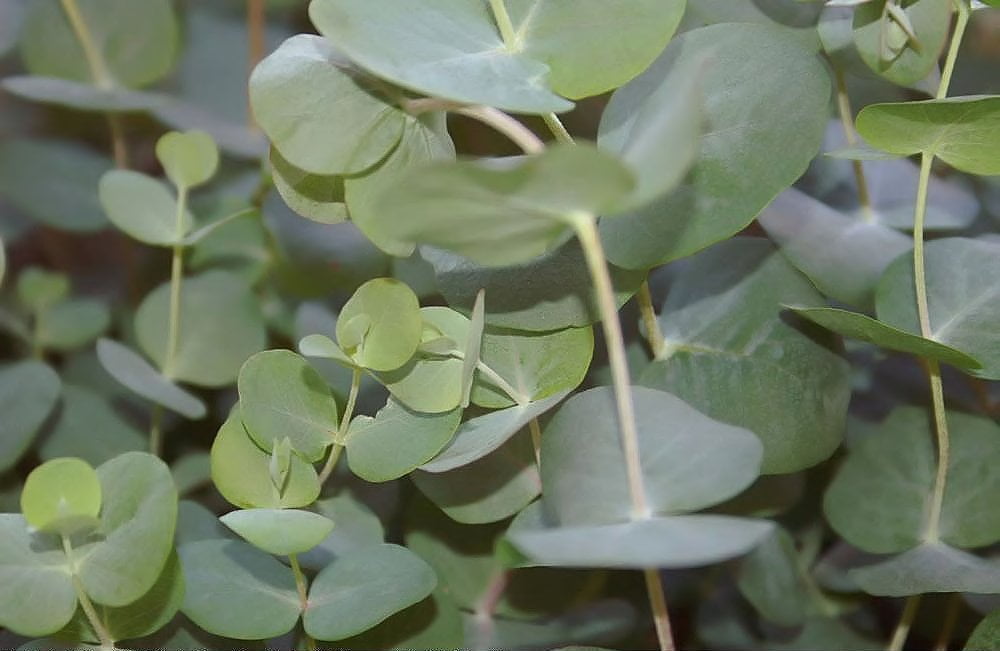 Árbol ornamental de follaje redondeado y plateado, muy aromático. Sus hojas desprenden un aroma refrescante y son ampliamente usadas en floristería. Produce pequeñas flores blancas que atraen abejas y aves, aportando interés estético todo el año.