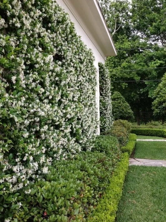 Planta trepadora con flores blancas fragantes; ideal para pérgolas, enrejados y jardines aromáticos.