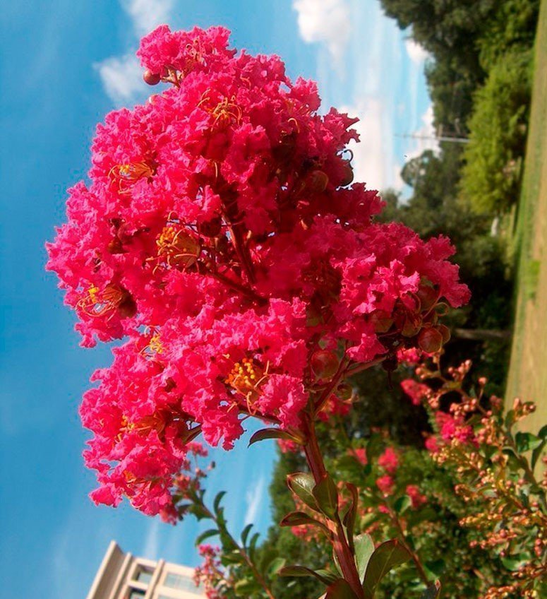 Árbol o arbusto ornamental de floración abundante y vistosa, con racimos de tonos rosados, lilas o blancos que cubren casi toda la copa en verano. Su corteza lisa y su follaje que vira al rojo y dorado en otoño lo vuelven muy decorativo.