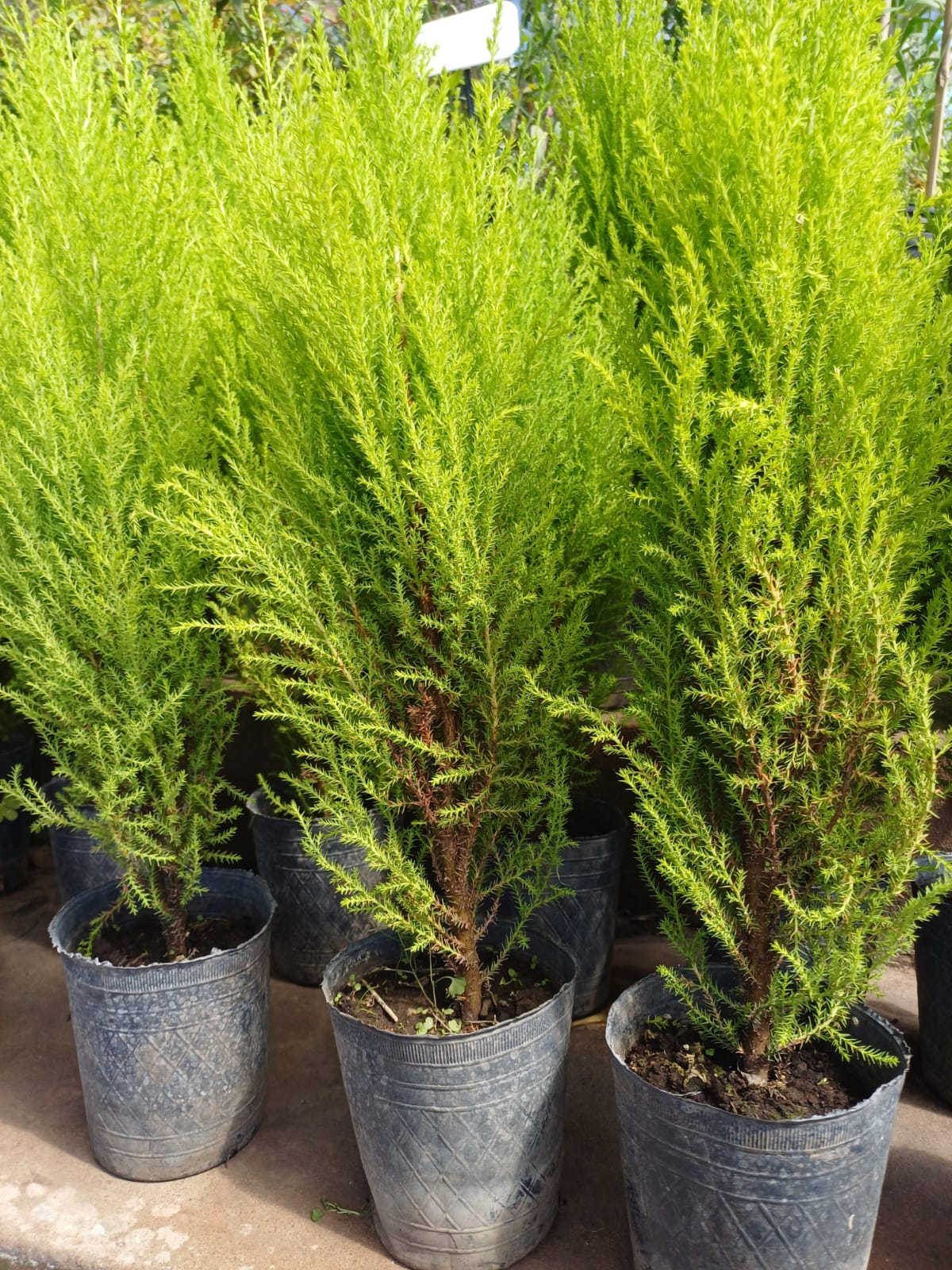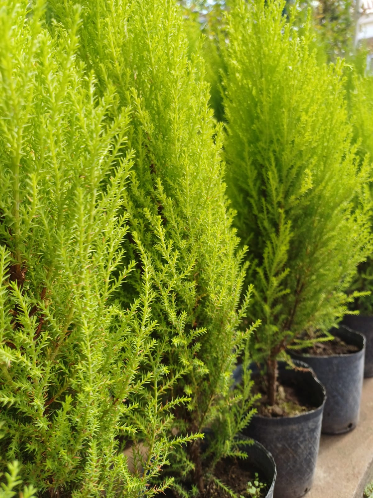 Conífera ornamental de follaje amarillo-verdoso y aroma cítrico, muy usada en macetas y jardines formales por su porte compacto.
