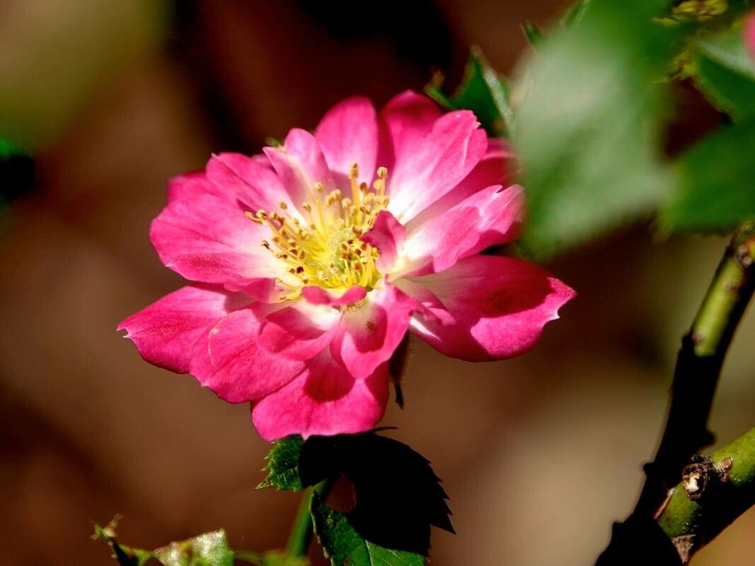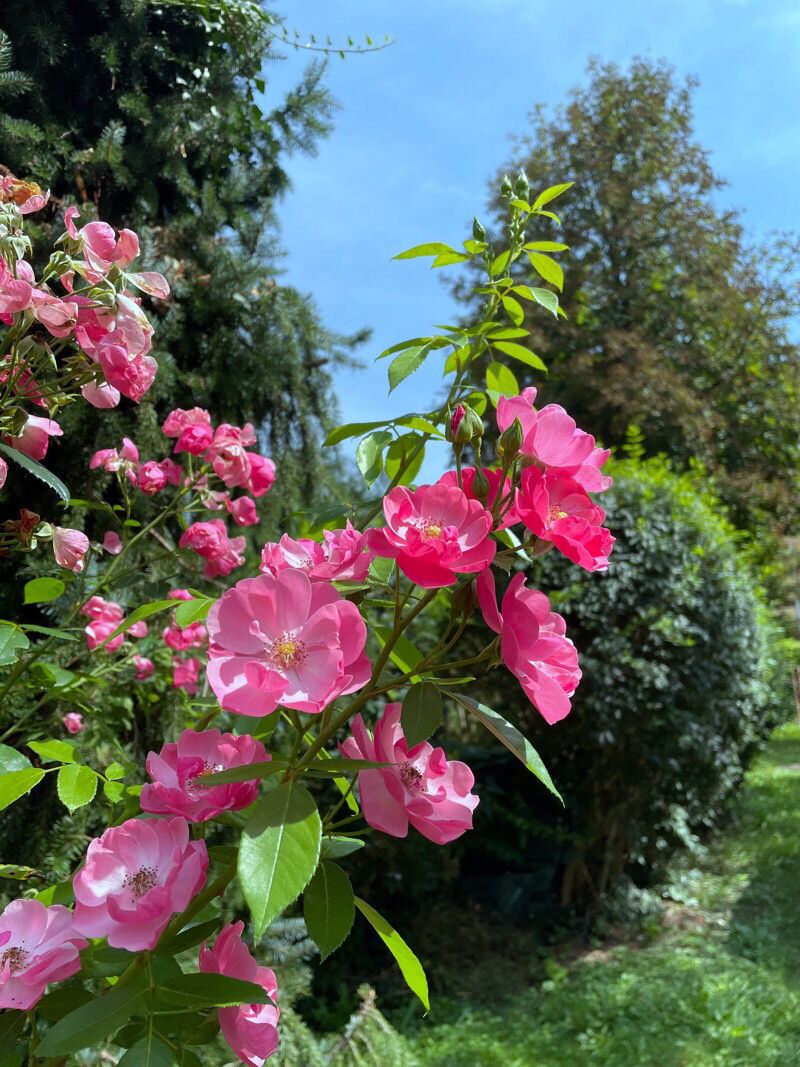 Trepadora de ramas arqueadas y flores fucsias colgantes muy decorativas, ideal para pérgolas o muros.