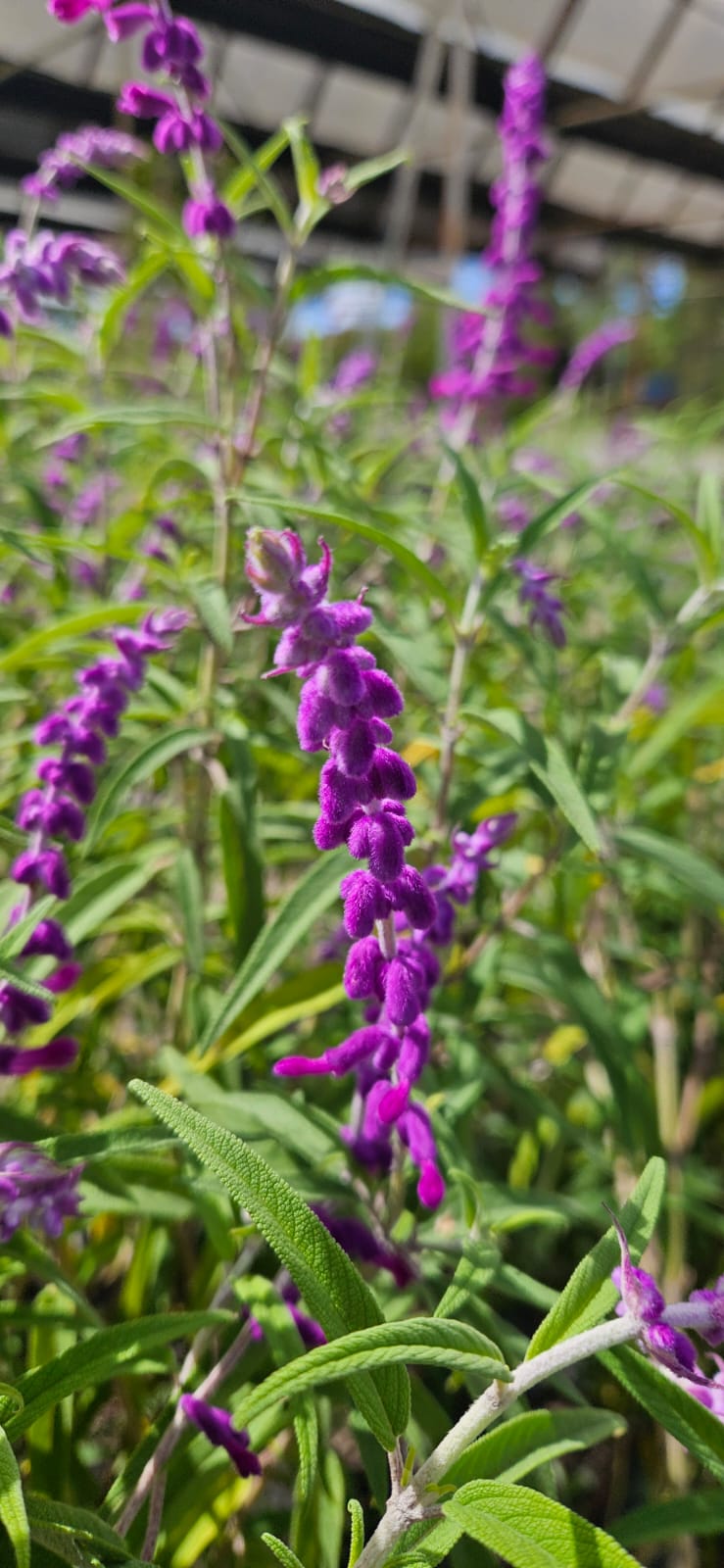 Arbusto perenne con varas largas cubiertas de flores violetas aterciopeladas, muy atractivo para polinizadores.
