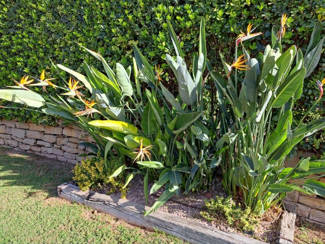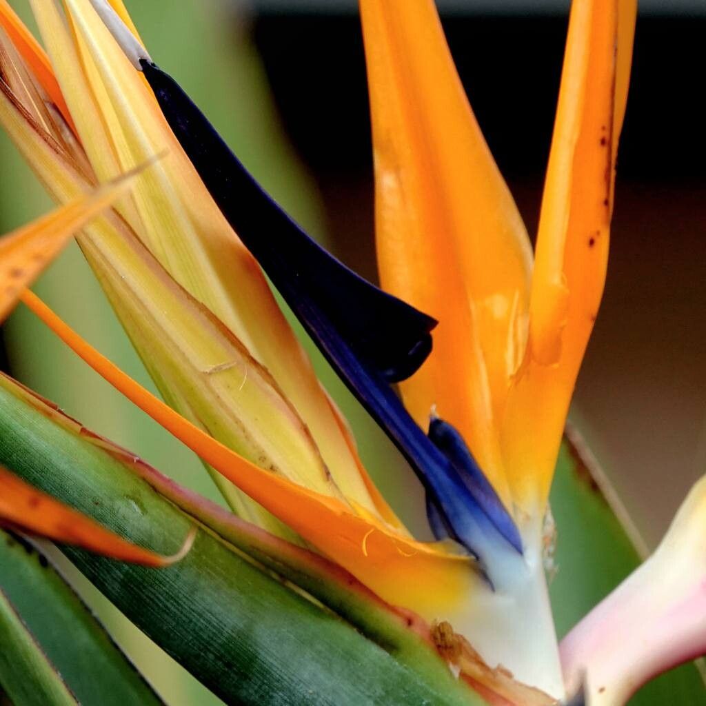 Planta perenne de porte elegante con hojas rígidas y flores naranjas y azules de forma exótica, muy usada como ornamental.
